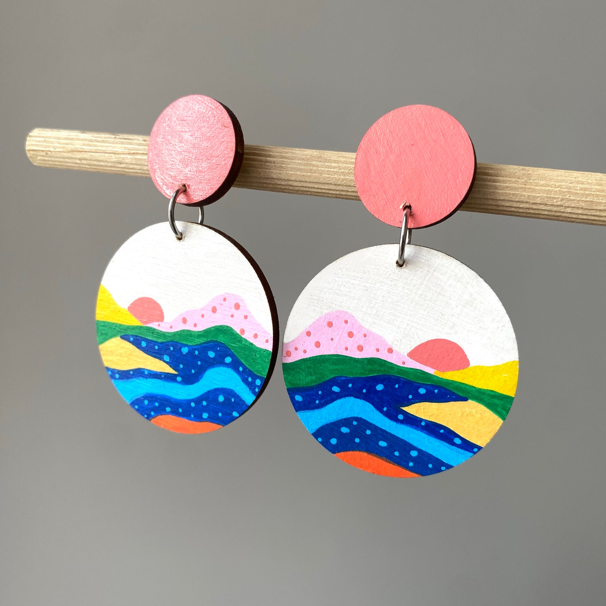 Bring a touch of art to your every day style. These circular earrings feature an abstract landscape design, carefully hand-painted in Bristol.