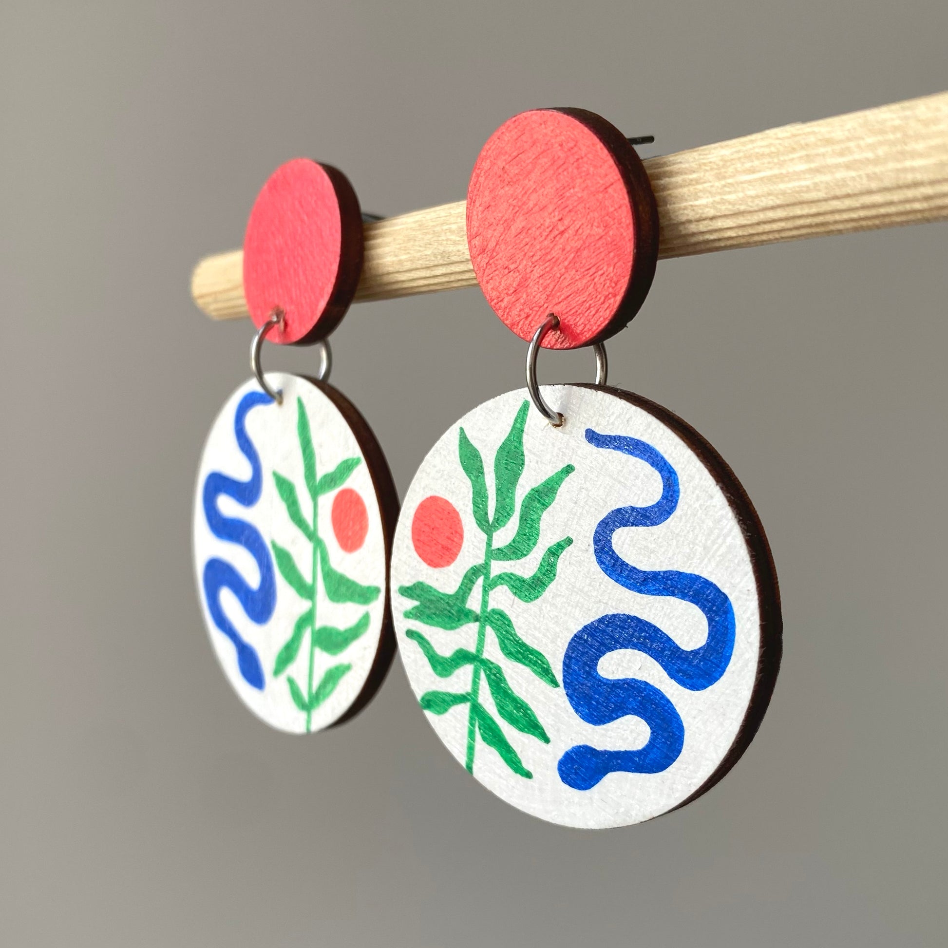Bring a touch of art to your every day style. These circular earrings feature an abstract snake and botanical design, carefully hand-painted in Bristol.